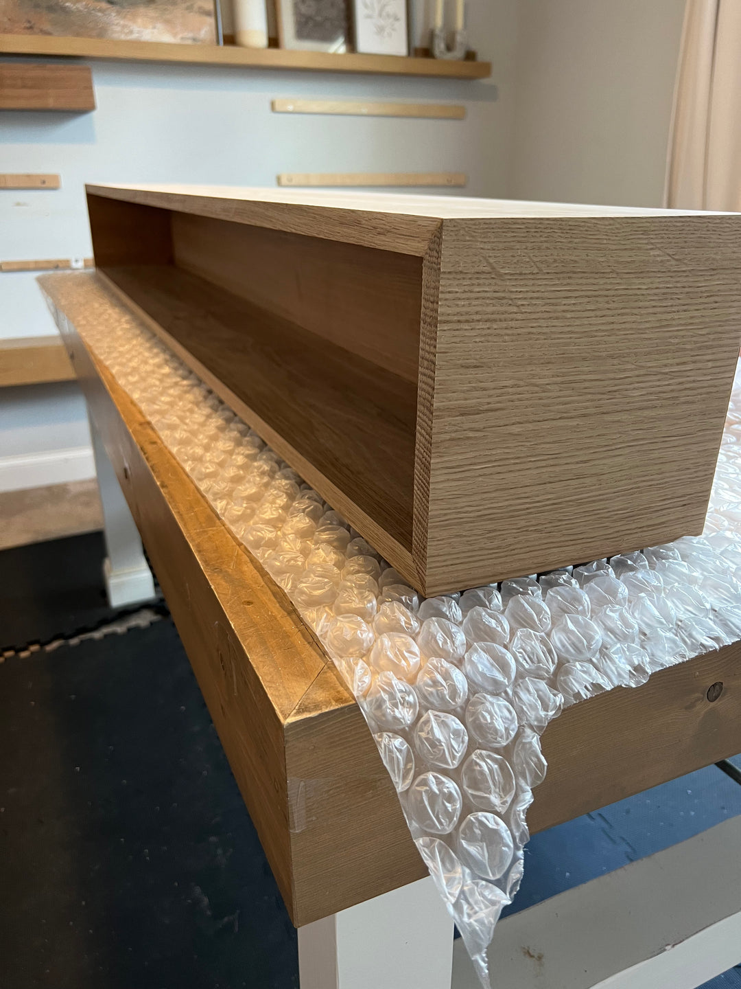 You can customize your mantel color with our finishing options to help match your existing wood floors. We recommend using white oak hardwood + Rubio Monocoat for this!
