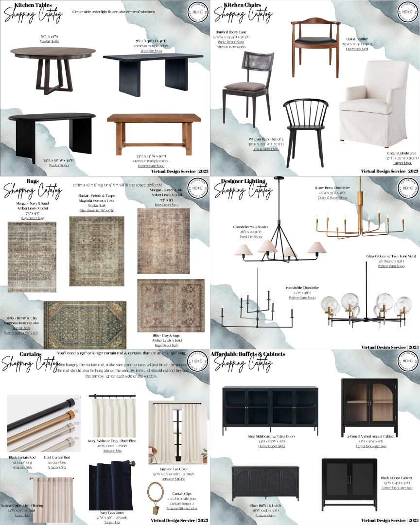 Three design mood boards to paint the vision and to give you confidence on which look is best for your space! You’ll have a curated shopping catalog to make the online shopping effortless. Order your favorite products directly through the organized catalog links!