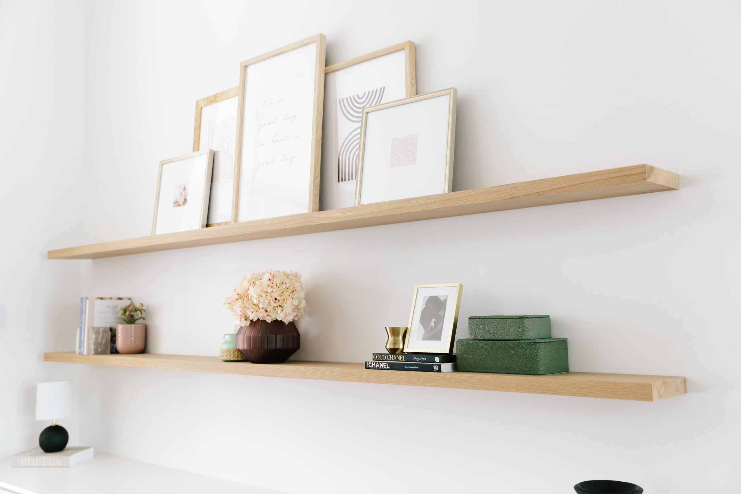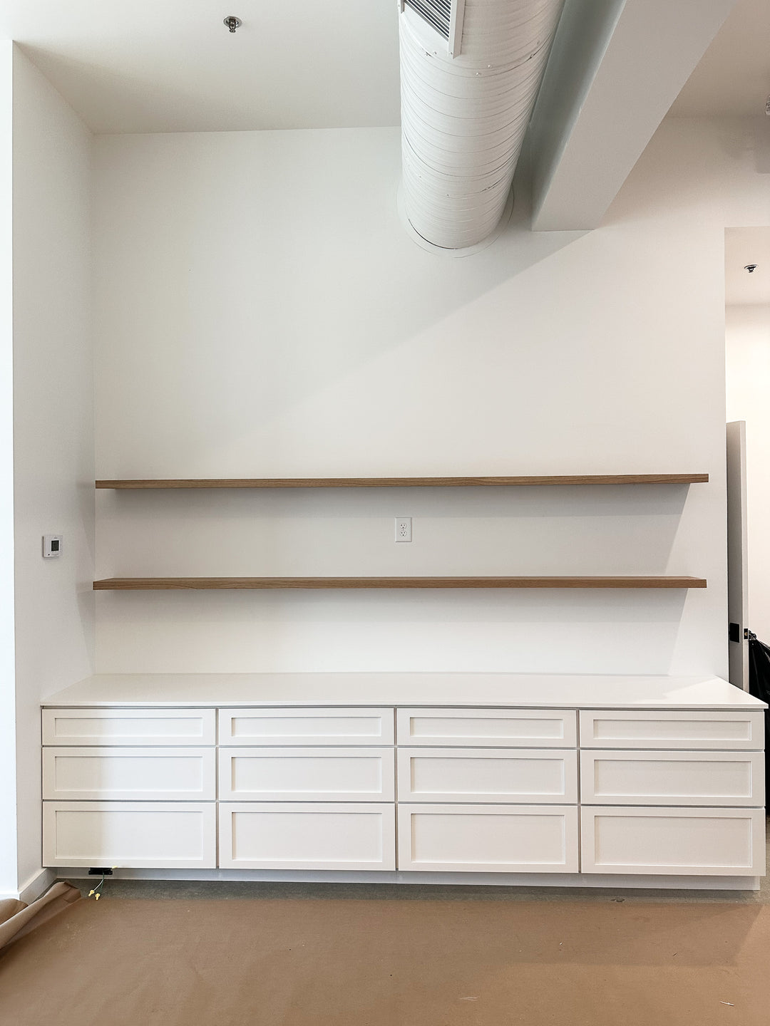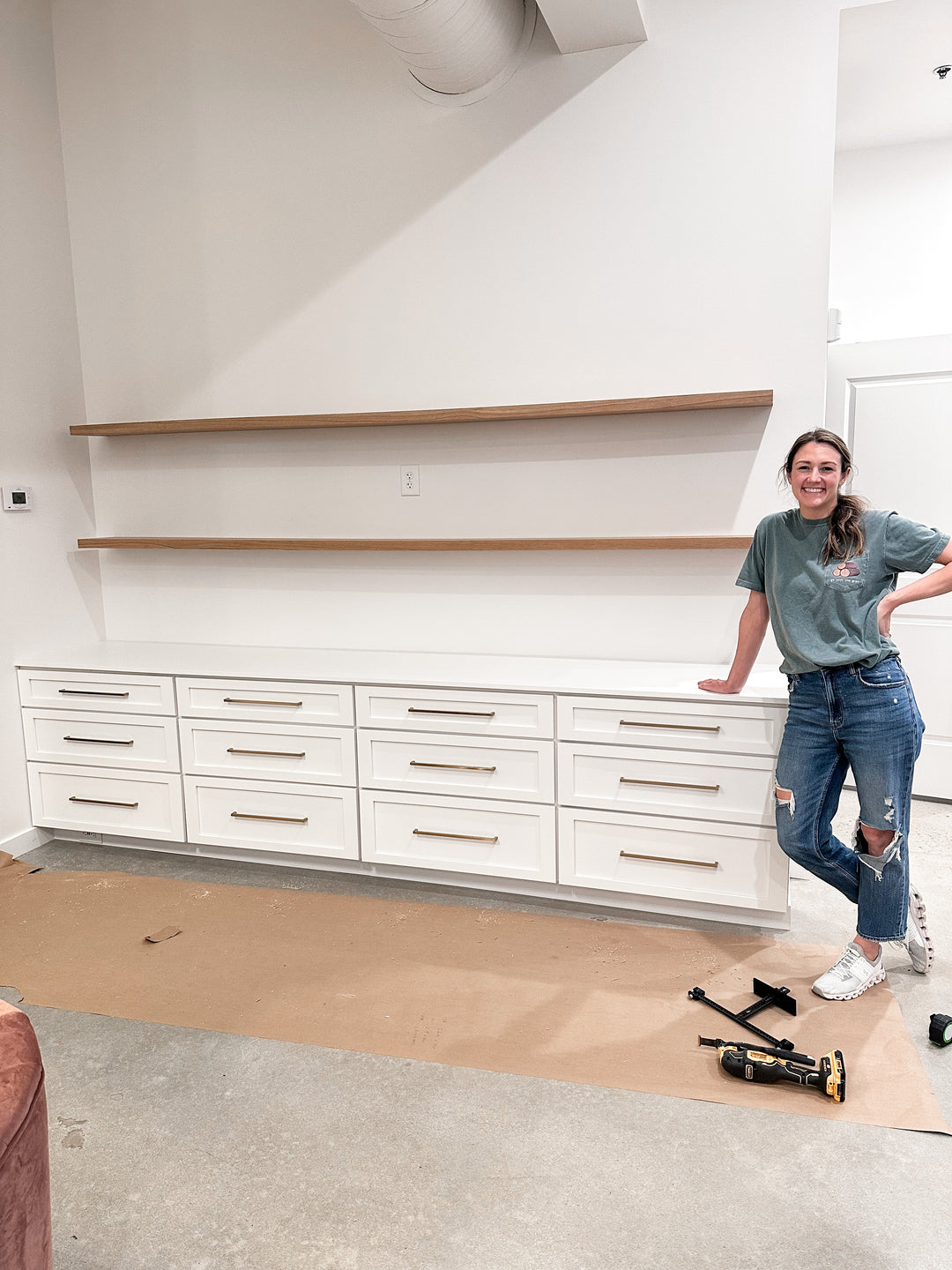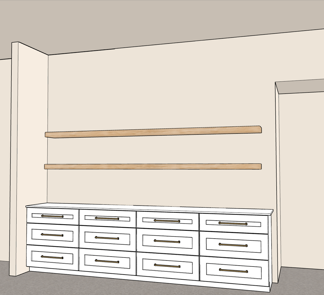 We used four, fully custom 3-drawers cabinets for the built-in, with a matching wooden top, oversized gold hardware & rift-sawn, white oak floating shelves.