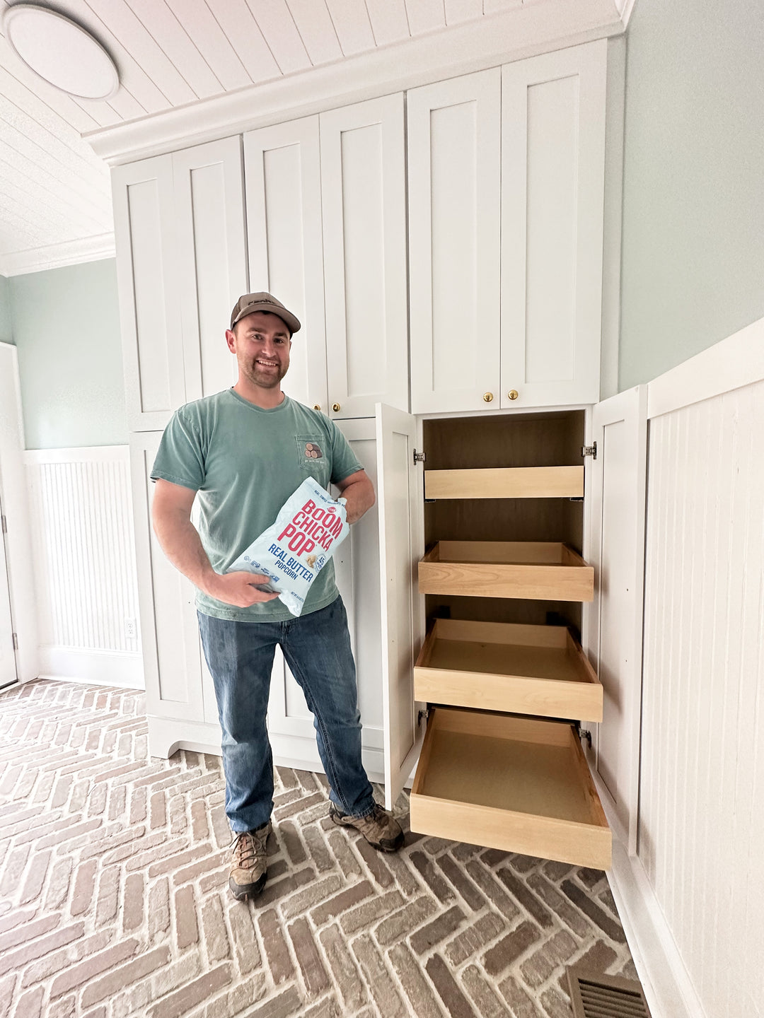 The bottom section of each cabinet has custom rollout drawers for easy access to all the items they keep inside! We built a custom arched toekick & added a shaker style end-cap to finish the project off.