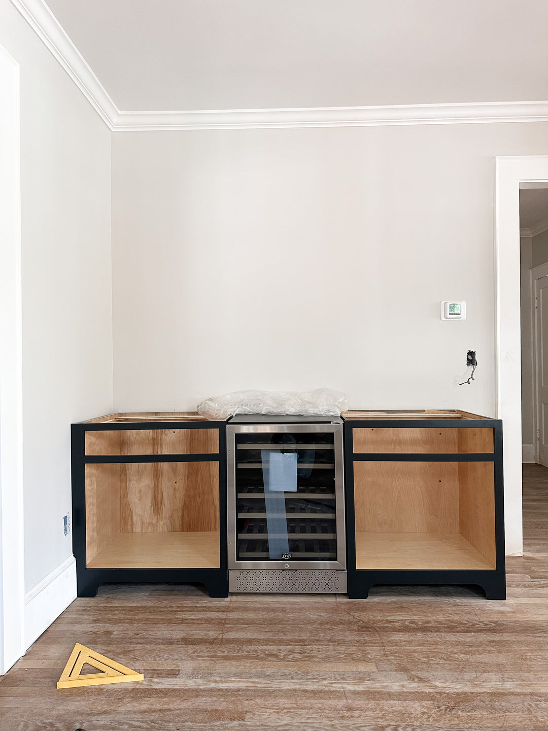 We took it a step further by painting the inside of the two cabinets with glass doors. The inside-back of those cabinet match the existing wall color Campfire Ash & the remaining inside/shelves are painted Greenblack to match the outside.