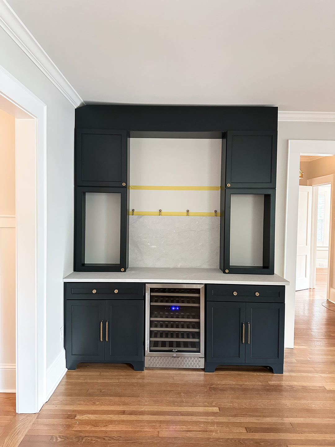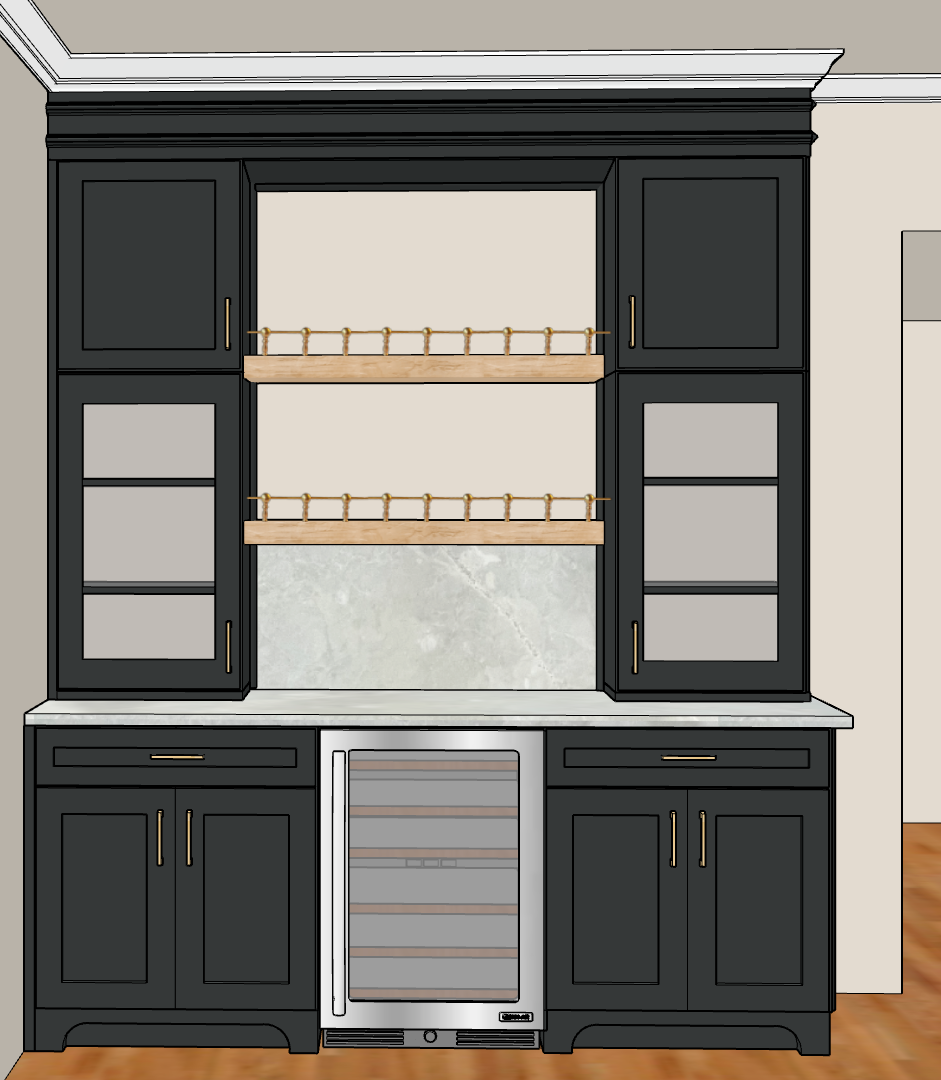 Fully-custom dry bar area painted Greenblack & paired with vintage gold hardware. Countertop & backsplash are Valentino quartzite.
