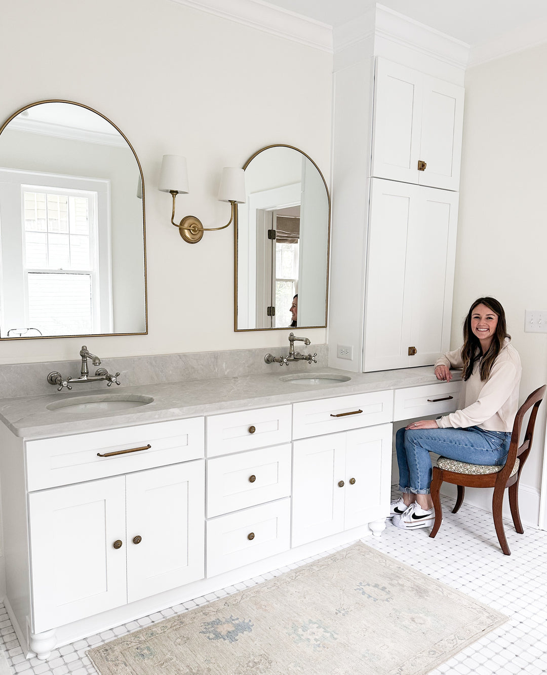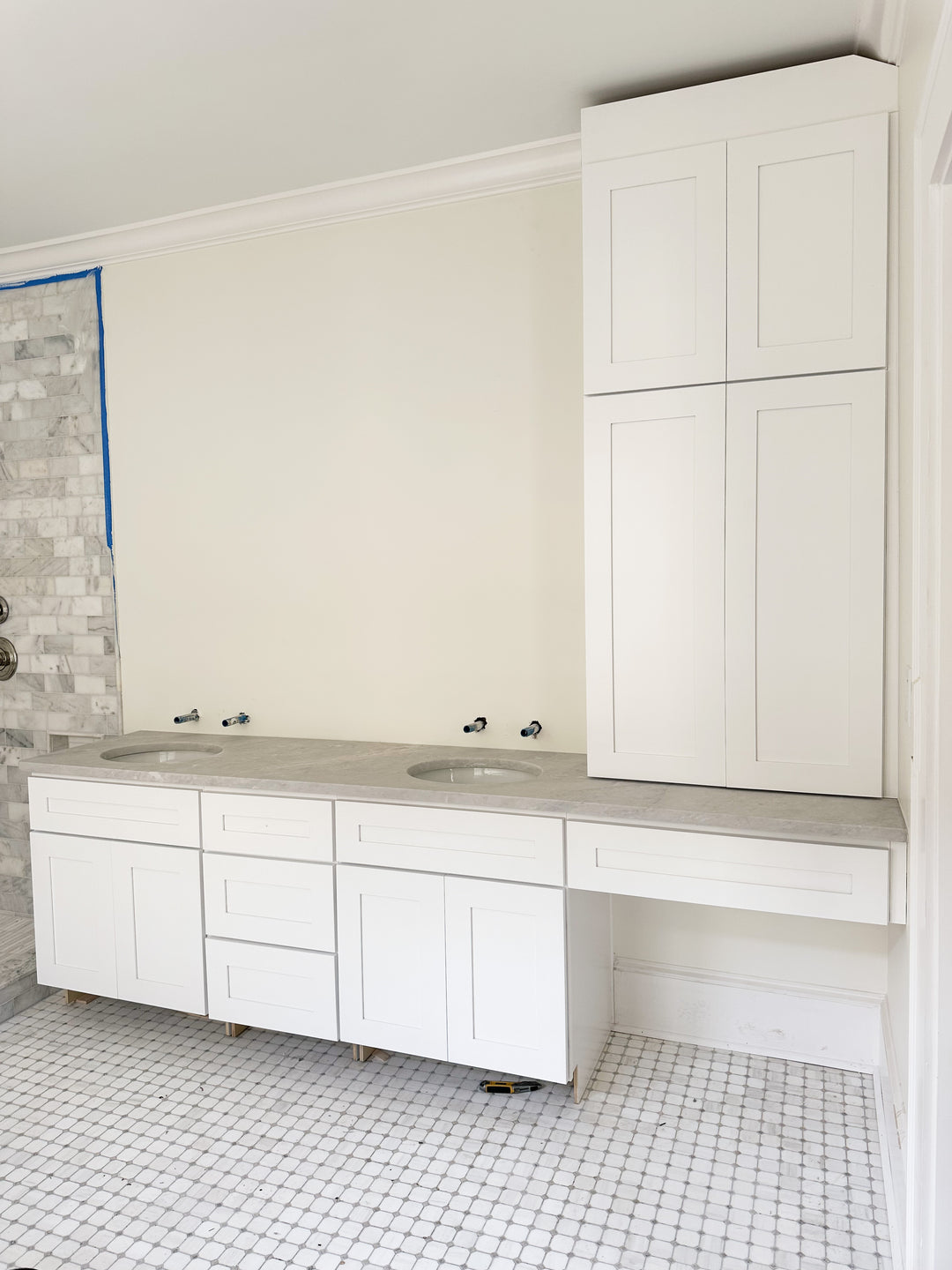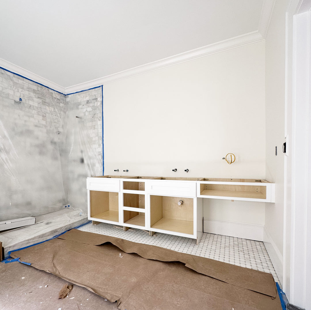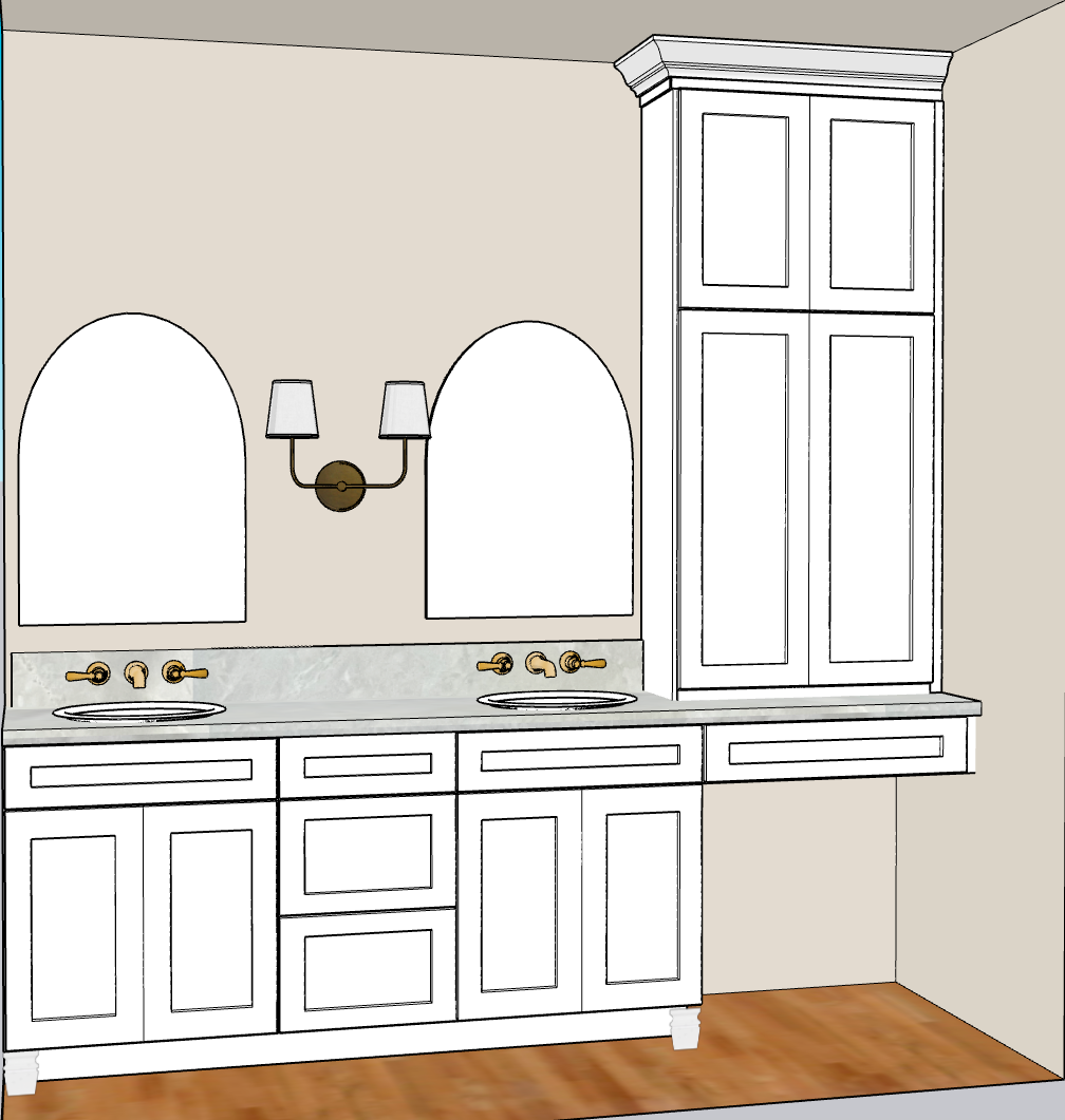 Our client was undergoing a bathroom renovation & needed help with cabinetry! Using our semi-custom cabinets, we created this double sink vanity with a sitting area & countertop storage to the ceiling.