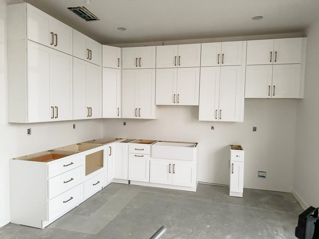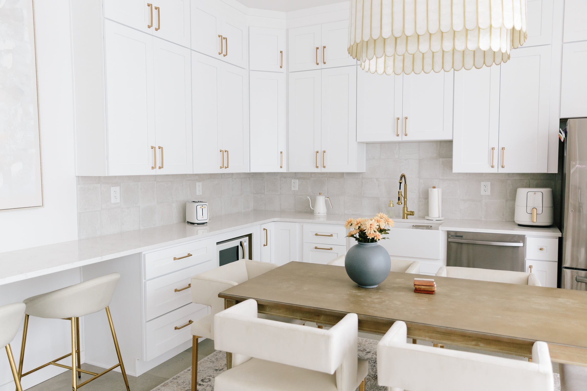 We used out semi-custom cabinet line & the clients picked a white shaker-style door paired with champagne gold hardware.